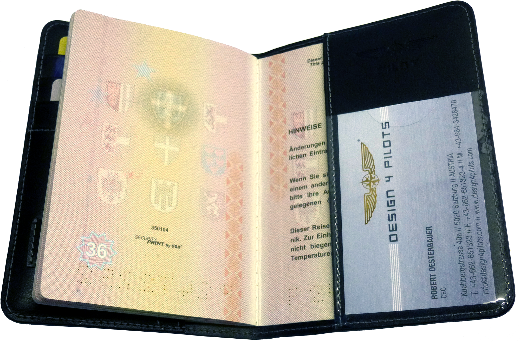 one passport cover with silver metal wing on the outside, an embossed PILOT®-logo inside, three pockets for credit cards, one for a business card and a pocket for a SIM card. The passport cover is equipped with RFID protection